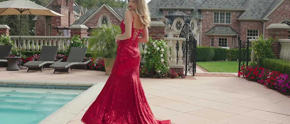 Sequin fit and flare graduation gown or evening dress with lace up illusion corset, lace and applique on bodice. 5" horse hair hem and side slit.
